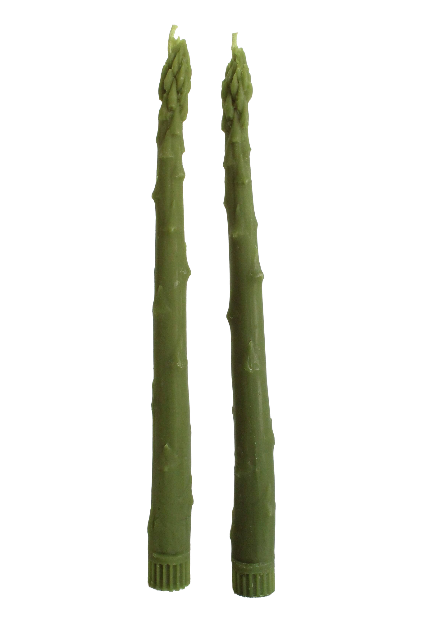 Handcrafted from 100% beeswax and molded from real asparagus stalks, this elegant candle set brings a playful yet refined touch to any shelf.
