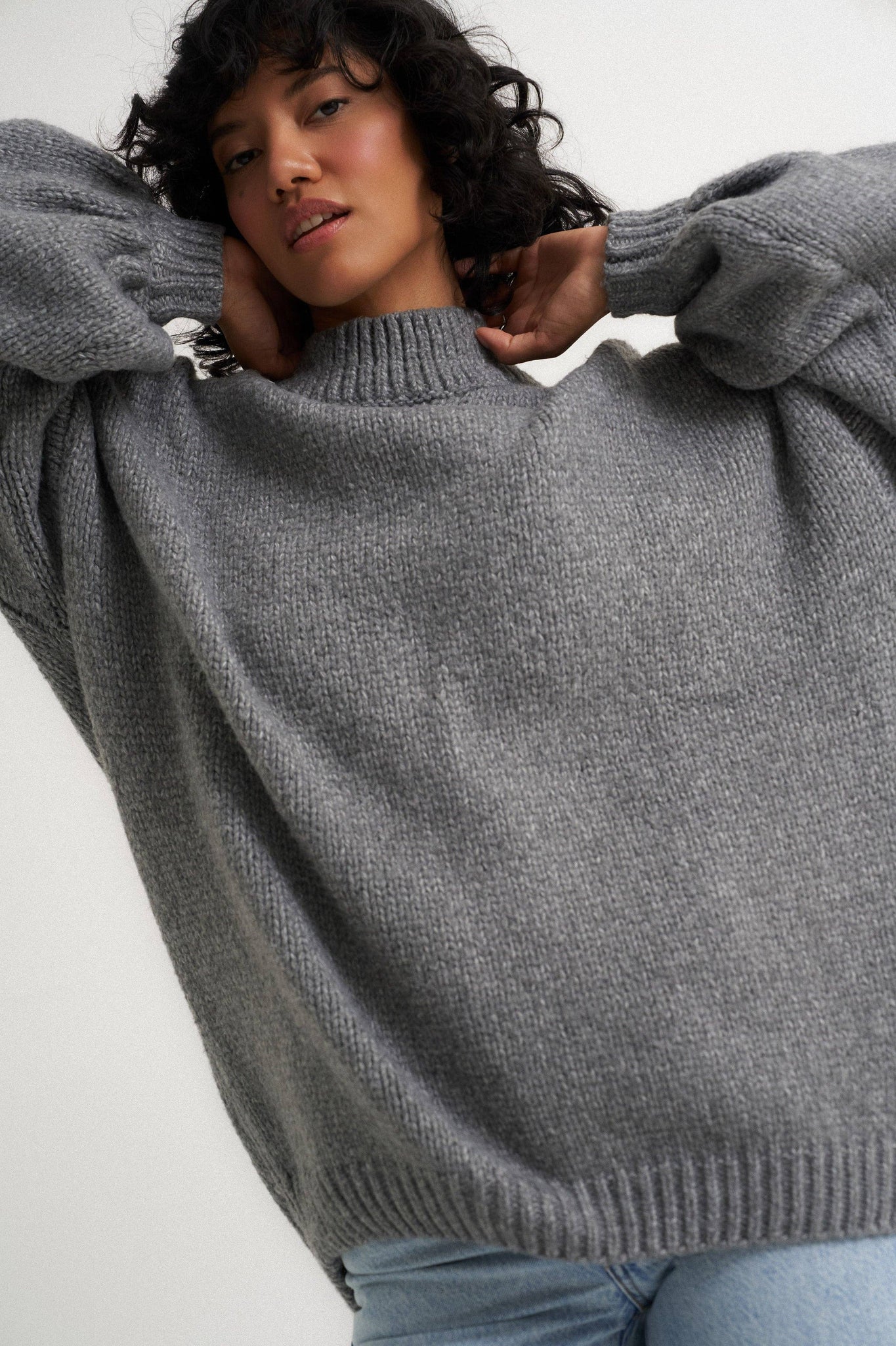 A soft, oversized knit sweater with balloon sleeves, and ribbed crew neckline.