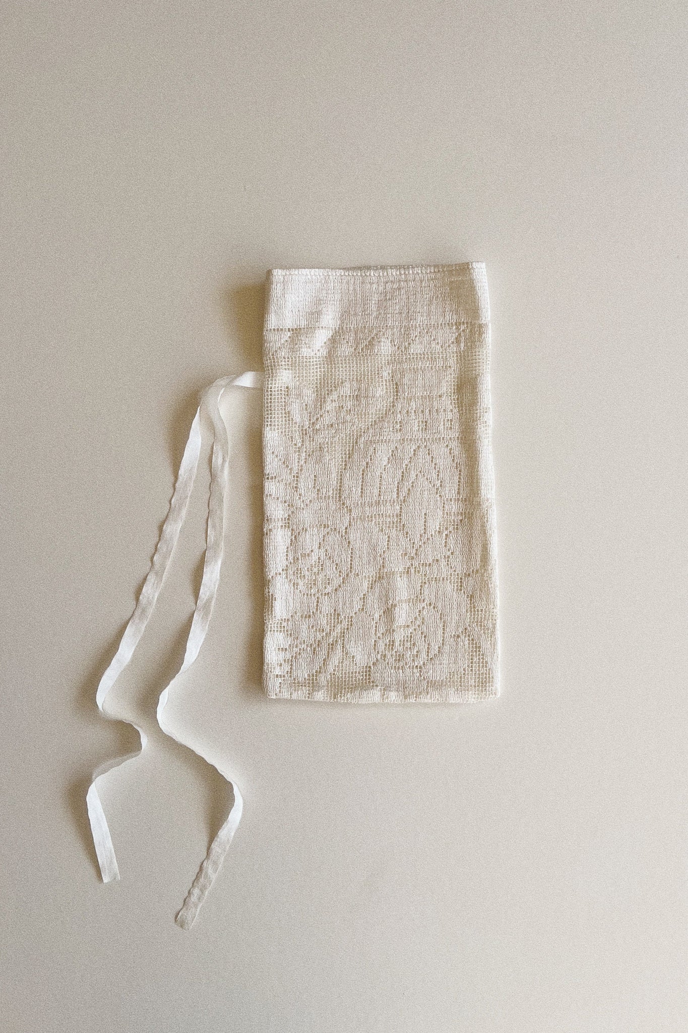 Hand-sewn from vintage lace tablecloths and faux dupioni silk ribbon.